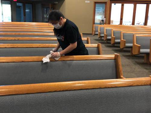 每次崇拜前我們都會在禮堂裡進行消毒,確保環境清潔。