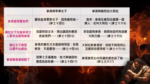 分享:在聖經中,記載了參孫的三段情,分別是亭拿女子、迦薩妓女及梭烈谷大利拉。其中關於亭拿女子(參士師記十四1-19)及梭烈谷大利拉 (參士師記十六4-22) 的記載較長,也有其相似之處。對比兩處記載,讓我們看到參孫重複犯上同一錯誤 *。首先,參孫都深愛他們;然後,兩位女子也被非利士人要求去誆哄參孫;繼而,兩位女子都是以愛作威迫的藉口;最後,參孫最後都就範了。