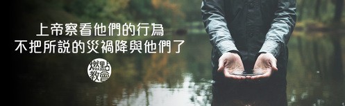 1 耶和華的話二次臨到約拿說: 2「你起來!往尼尼微大城去,向其中的居民宣告我所吩咐你的話。」 3 約拿便照耶和華的話起來,往尼尼微去。這尼尼微是極大的城,有三日的路程。 4 約拿進城走了一日,宣告說:「再等四十日,尼尼微必傾覆了!」 5 尼尼微人信服上帝,便宣告禁食,從最大的到至小的都穿麻衣。6 這信息傳到尼尼微王的耳中,他就下了寶座,脫下朝服,披上麻布,坐在灰中。 7 他又使人遍告尼尼微通城,說:「王和大臣有令,人不可嘗甚麼,牲畜、牛羊不可吃草,也不可喝水。 8 人與牲畜都當披上麻布;人要切切求告上帝。各人回頭離開所行的惡道,丟棄手中的強暴。 9 或者上帝轉意後悔,不發烈怒,使我們不致滅亡,也未可知。」10 於是上帝察看他們的行為,見他們離開惡道,他就後悔,不把所說的災禍降與他們了。(約拿書三1-10)