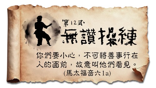1 你們要小心,不可將善事行在人的面前,故意叫他們看見,若是這樣,就不能得你們天父的賞賜了。2 所以,你施捨的時候,不可在你前面吹號,像那假冒為善的人在會堂裏和街道上所行的,故意要得人的榮耀。我實在告訴你們,他們已經得了他們的賞賜。3 你施捨的時候,不要叫左手知道右手所做的,4 要叫你施捨的事行在暗中。你父在暗中察看,必然報答你 。(馬太福音六1-4)