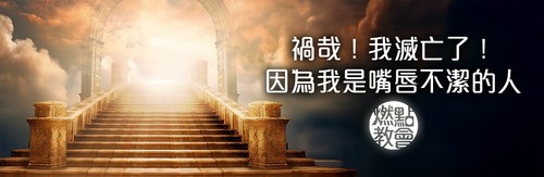 1 當烏西雅王崩的那年,我見主坐在高高的寶座上。祂的衣裳垂下,遮滿聖殿。2 其上有撒拉弗侍立,各有六個翅膀:用兩個翅膀遮臉,兩個翅膀遮腳,兩個翅膀飛翔;3 彼此呼喊說:聖哉!聖哉!聖哉!萬軍之耶和華;祂的榮光充滿全地!4 因呼喊者的聲音,門檻的根基震動,殿充滿了煙雲。5 那時我說:「禍哉!我滅亡了!因為我是嘴唇不潔的人,又住在嘴唇不潔的民中,又因我眼見大君王-萬軍之耶和華。」6 有一撒拉弗飛到我跟前,手裏拿著紅炭,是用火剪從壇上取下來的,7 將炭沾我的口,說:「看哪,這炭沾了你的嘴,你的罪孽便除掉,你的罪惡就赦免了。」8 我又聽見主的聲音說:「我可以差遣誰呢?誰肯為我們去呢?」我說:「我在這裏,請差遣我!」(以賽亞書六1-8)
